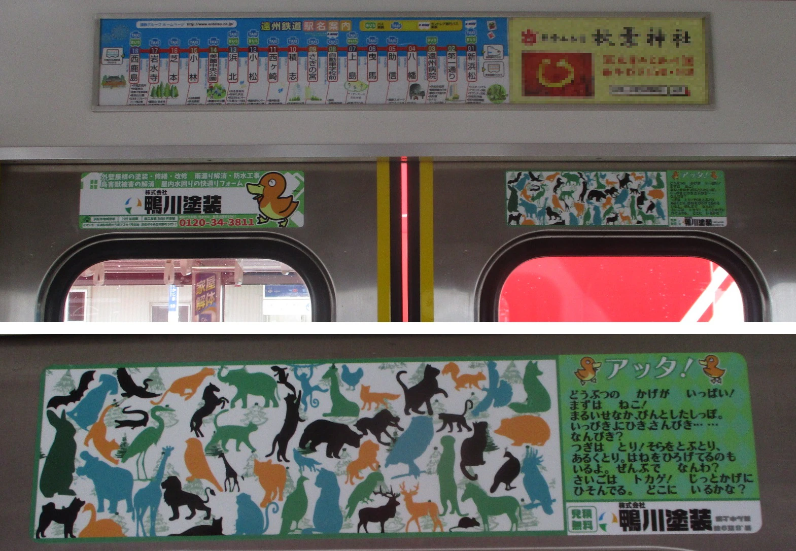 右側は動物シルエットの“探し絵”要素で、乗降時に思わず目を向けたくなるきっかけをつくります。🦆
